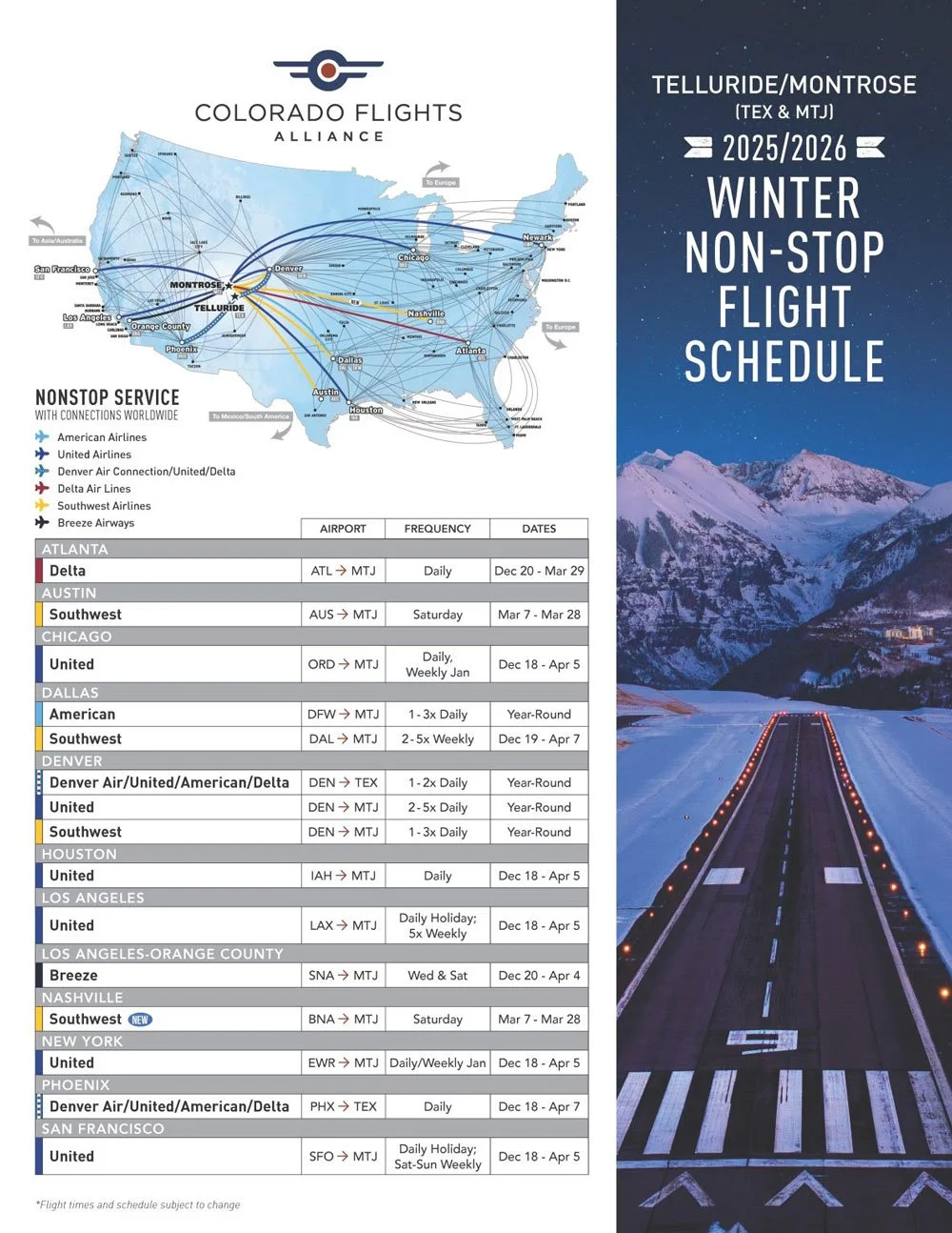 Flights are available directly into Telluride or nearby Montrose, Durango, Cortez, and Grand Junction. Five carriers service the airports with a variety of non-stop destinations. International airports in Denver, Salt Lake City, and Albuquerque offer a scenic and manageable drive away as well.